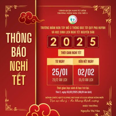 THÔNG BÁO: LỊCH NGHỈ TẾT NGUYÊN ĐÁN 2026 Kính gửi Quý phụ huynh học sinh trường MN Tây Mỗ 3! Năm 2025 sắp qua đi, năm 2026 đã cận kề. Một mùa xuân mới lại [...]